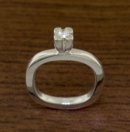 I came across my rounded-square ring mandrel while cleaning my studio one day and lamented that I don't use it enough. Naturally, this inspired me to find a use for it—and, as one does in a situation like this, I fixated on squares everywhere. I decided to make a rounded square ring out of square wire stock, and to make a square setting out of giant square prongs. The setting wound up reminding me of an absctracted tulip, and since everything was square, I decided to call it the Cubist Tulip Ring. Continuing in the square/cubist theme, I decided to set it with a 3mm cubic zirconia (always with the jokes).