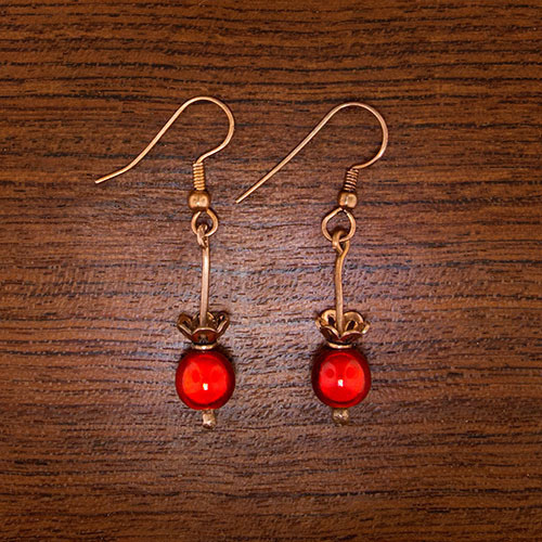 Originally conceived of as an accessory to another project that I haven't yet finished (this text will naturally change when I've finished the project in question). These pomegranate earrings use Japanese miracle beads for the body of the fruit and copper petal-shaped beads for the spray at the top. The reflective core and translucent laquered shell of the miracle beads bring to mind the seeds of a pomegranate, so there's that nice self-reflexivity going on.